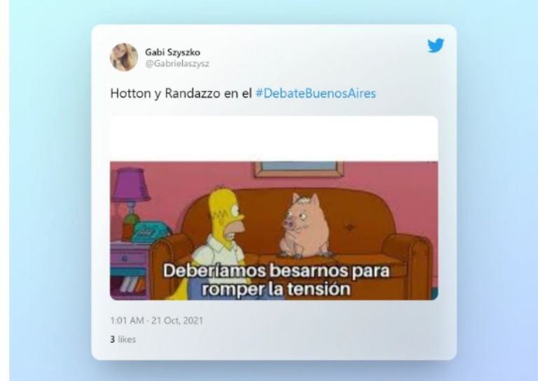 Apenas terminó el Debate Provincial en A dos Voces (TN), el ingenio de los usuarios copó las redes sociales. Las mejores perlitas que dejó el encuentro entre candidatos se trasladó a Twitter, donde no faltaron memes a partir de algunas muletillas que repitieron los candidatos. Diego Santilli (Juntos), Victoria Tolosa Paz (Frente de Todos), Nicolás Del Caño (FIT), José Luis Espert (Avanza Libertad), Florencio Randazzo (Vamos con Vos) y Cynthia Hotton (Más Valores), ninguno se salvó de las bromas virales.