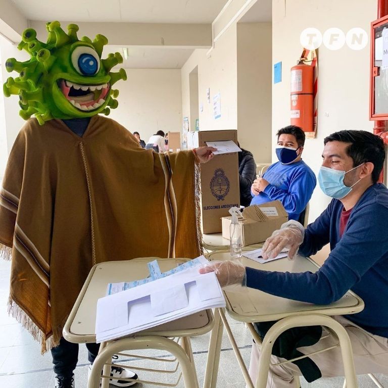 El 'coronavirus' fue a votar: una persona se puso la máscara y un poncho para ir a votar.