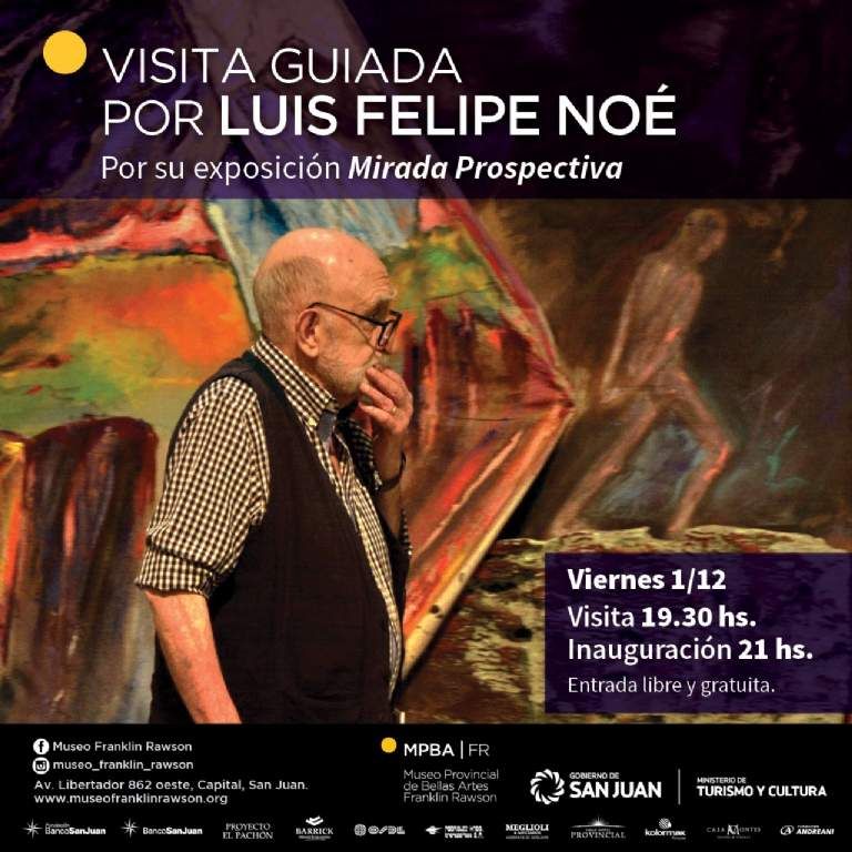 El prestigioso artista Luis Felipe Noé compartirá una experiencia única esta tarde con los sanjuaninos. En el Museo Provincial de Bellas Artes Franklin Rawson, recorrerá su última exposición "Mirada Prospectiva". La visita guiada encabezada por el artista plástico, crítico de arte. docente argentino y exponente de la Nueva Figuración, tiene entrada libre y gratuita y se inicia a las 19.30 horas mientras que la inauguración de la muestra será desde las 21.