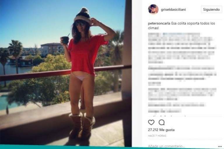 La temporada de verano hace que ellas y ellos aprovechen a presumir en las redes sociales sus lomazos forjados de horas de entrenamiento y rigurosa dieta, pero hay algunos famosos que no soportan que los condicione el tiempo y se animan a mostrarse con poca o nada de ropa en pleno invierno. ¿Un ejemplo? Griselda Siciliani (39). Como muchos de sus comentaristas, su amiga Carla Peterson la elogió con un desopilante piropo.