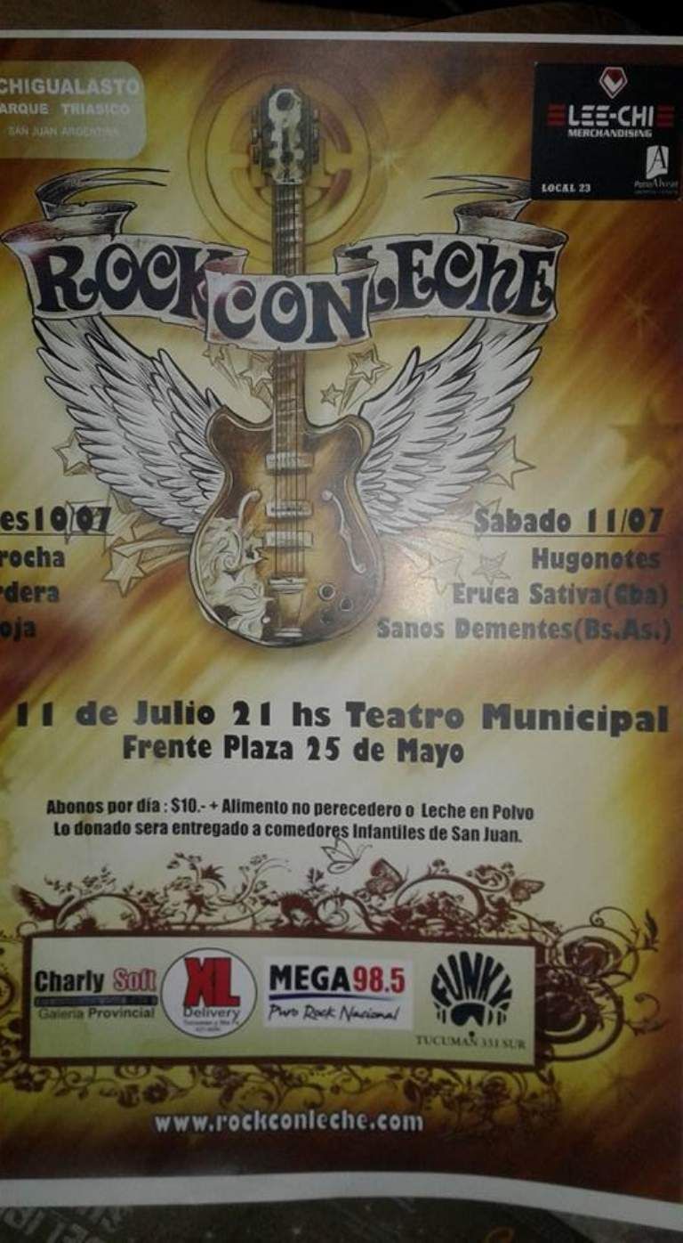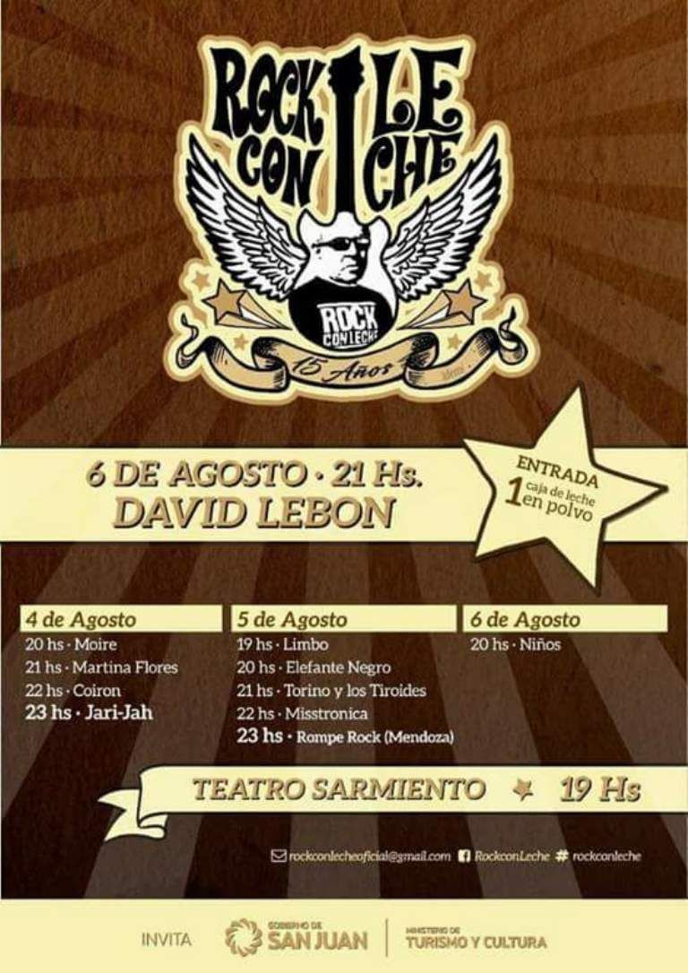 La edición 2017, que coincide con los 15 años del primer Rock con Leche, será durante 3 días (4, 5 y 6 de agosto) y tendrá presencia de 10 bandas sanjuaninas, una de Mendoza y el cierre de David Lebón. En la boletería del Teatro Sarmiento entregarán las entradas a cambio de una caja de leche en polvo y cada una permitirá la entrada a uno de los días del festival.