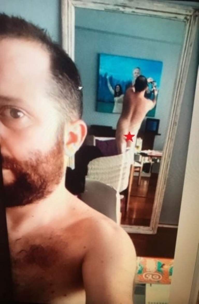 Ottavis está de espaldas a un espejo y se refleja el cuerpo del dirigente político completamente desnudo mostrando la cola.