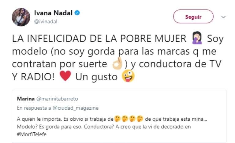 Ante la publicación de un portal sobre la rutina de ejercicios de Ivana Nadal para mantenerse en forma, una usuaria criticó a la modelo: “A quién le importa. Es obvio si trabaja de (emoticones de carita pensativa). De qué trabaja esta mina... ¿Modelo? ¡Es gorda para eso! ¿Conductora? A creo que la vi de decorado en #MorfiTelefe”.