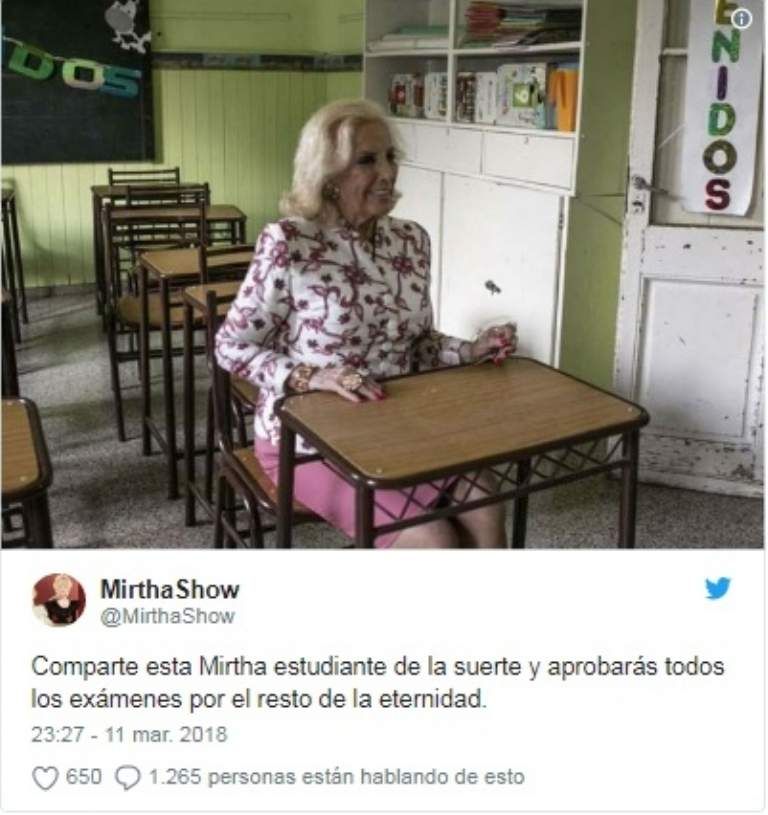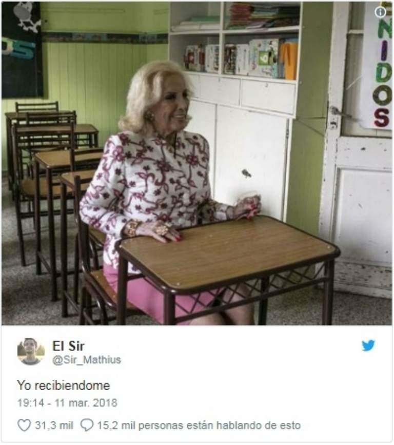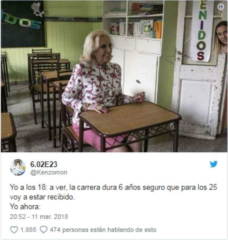 A sus 91 años, la diva de los almuerzos aprovechó pasa sacarse una foto en un viejo pupitre de la escuela, y automáticamente la imagen se volvió un meme...y fue replicada por aquellos que tardan años en recibirse o que se tienen poca fe en los estudios.