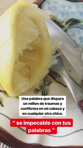 Y prosiguió en otra publicación: “Una palabra dispara un millón de traumas y conflictos en mi cabeza y en cualquier otra chica”. Con la imagen del limón ya exprimido, lanzó una fuerte frase para reflexionar: “Sé impecable con tus palabras”.