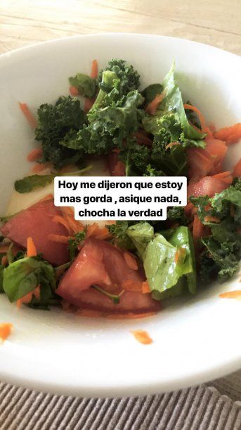 SUSCRIBITE“Hoy me dijeron que estoy más gorda, así que nada, chocha la verdad”, escribió Candelaria Tinelli en sus historias de Instagram, con una foto de una ensalada básica de fondo, que apenas contenía tomate, lechuga y zanahoria.