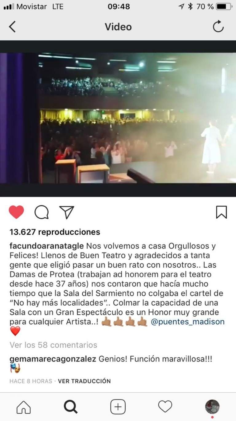 El actor Facundo Arana compartió una publicación en su cuenta de Instagram en la que agradeció la respuesta y el cariño que recibió del público sanjuanino durante la presentación de Los Puentes de Madison, este pasado domingo, en el Teatro Sarmiento.