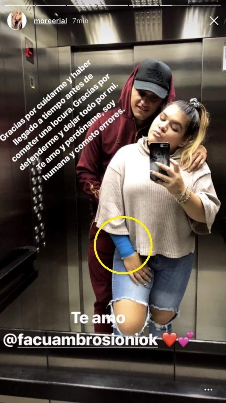 Tras trascender la imagen donde se la ve a Morena firmando, muchos en la red se preguntaron qué tenía en la muñeca. Pero el tema quedó ahí. Hasta el día siguiente, el viernes, cuando la misma joven compartió otras imágenes donde se ve lo que parece ser una venda en su muñeca, y un mensaje preocupante dedicado a su novio, Facundo Ambrosioni.