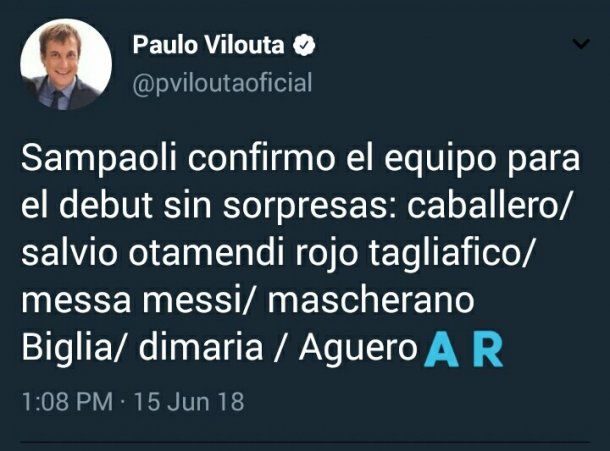 Paulo Vilouta tuvo un desliz a la hora de publicar en su cuenta de Twitter el equipo de la Selección argentina que eligió Jorge Sampaoli para enfrentar a Islandia este sábado.