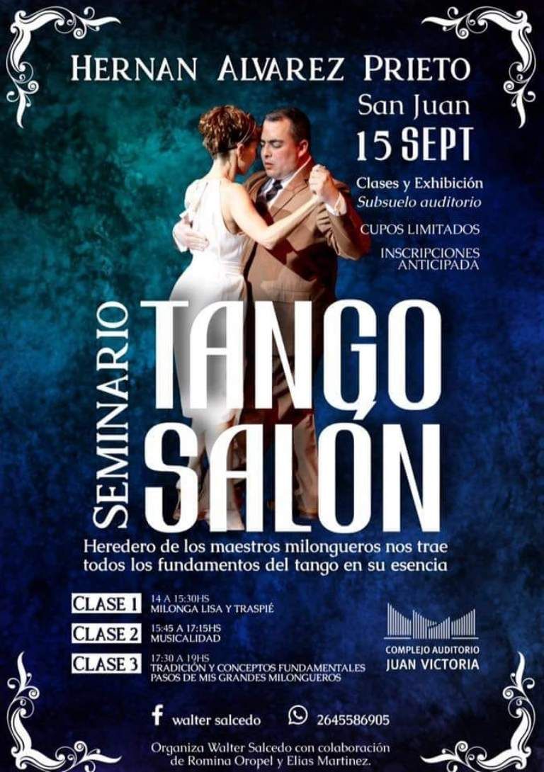 En San Juan, la presencia de Hernán Álvarez Prieto es auspiciada por tres organizadores particulares: Walter Salcedo, Elías Martínez y quien suscribe estas líneas, y por el Auditorio Juan Victoria donde se llevara a cabo un seminario, el sábado 15 de septiembre, por la tarde. Los eventos cierran con una milonga para todo el público en el bar Barba Negra (Mendoza 1840 - sur), a partir de las 22.30 hs, donde se podrá disfrutar de una exhibición del maestro acompañado por mí, una de sus más grandes admiradoras.