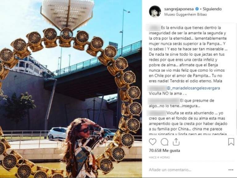 A raíz de su posteo, usuarios la trataron de “irrespetuosa” y le cuestionaron que hiciera referencia a su casamiento un día como hoy: “@benjavicunamori que tenga más respeto tu mujer por el dia de hoy por lo menos. Cero empatía”, expresó un comentario mientras que otra usuaria le escribió que “no era necesario la foto ni el anillo... feo”.