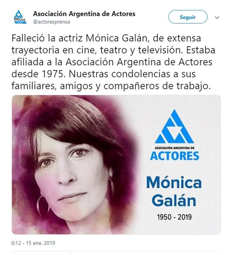 "Con su talento interpretativo mantuvo una extensa trayectoria en cine, teatro y televisión. Estaba afiliada a la Asociación desde 1975. Nuestras condolencias a sus familiares, amigos y compañeros de trabajo", publicó la cuenta en Twitter de la entidad.