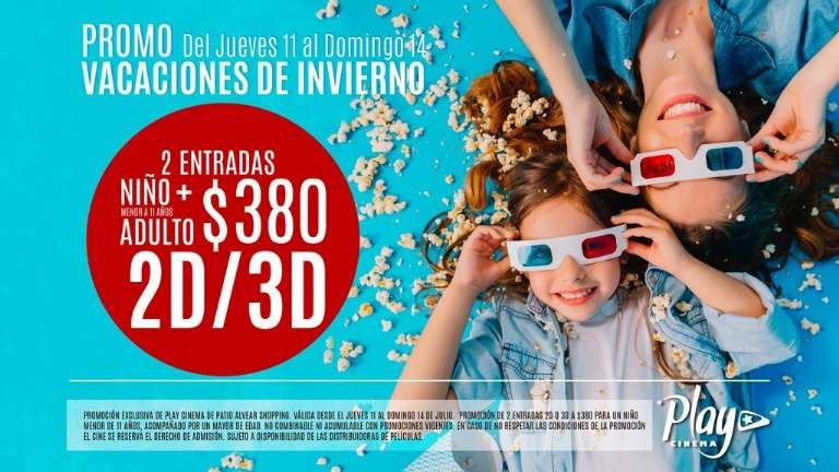 Desde este jueves 11 de julio hasta el domingo 14 comprando de contado dos entradas 2D o 3D, para un niño menor de 11 años acompañado de un adulto, ambas entradas tendrá un precio especial total de $380. Esta promoción solo es válida para el Play Cinema de Patio Alvear Shopping.