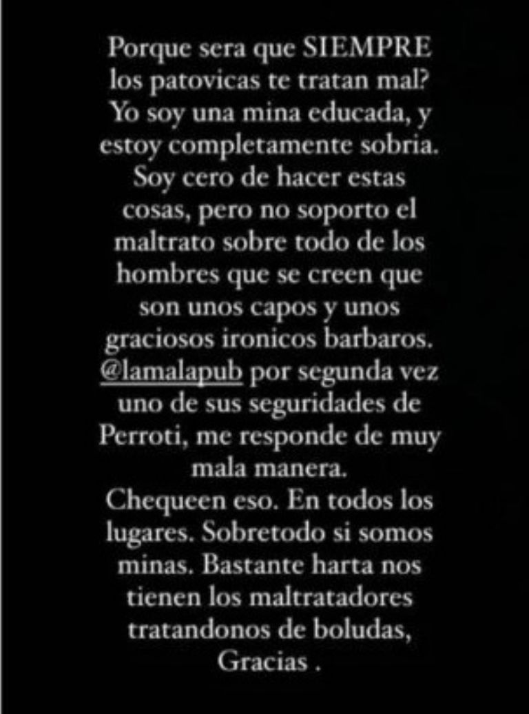 “Bueno, borré la historia porque se comunicaron conmigo de parte del bar y de la seguridad. Gracias por la buena onda. Gracias por pedirme disculpas. Esto no tiene que seguir pasando en los bares, boliches. No está bueno que un patovica te agreda o te trate mal, es innecesario. ¿No se por qué se creen superiores a uno? Nada, ese mensaje. Hay que cortarla con la agresión al pedo, sobre todo con las mujeres”.