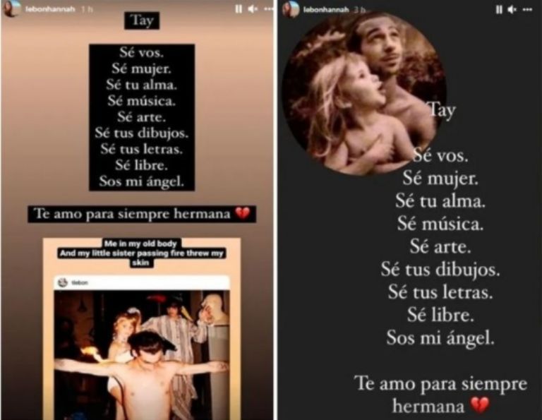 "Tay. Sé vos. Sé mujer. Sé tu alma. Sé arte. Sé tus dibujos. Sé tus letras. Sé libre. ¡Sos mi ángel. Te amo para siempre hermana", expresó Hannah en sus historias de Instagram. En el posteo incluyó una imagen en la que está junto a su hermana. Imagen que tiempo atrás había compartido la misma Tayda en su propia cuenta de la mencionada red social.