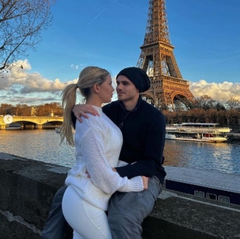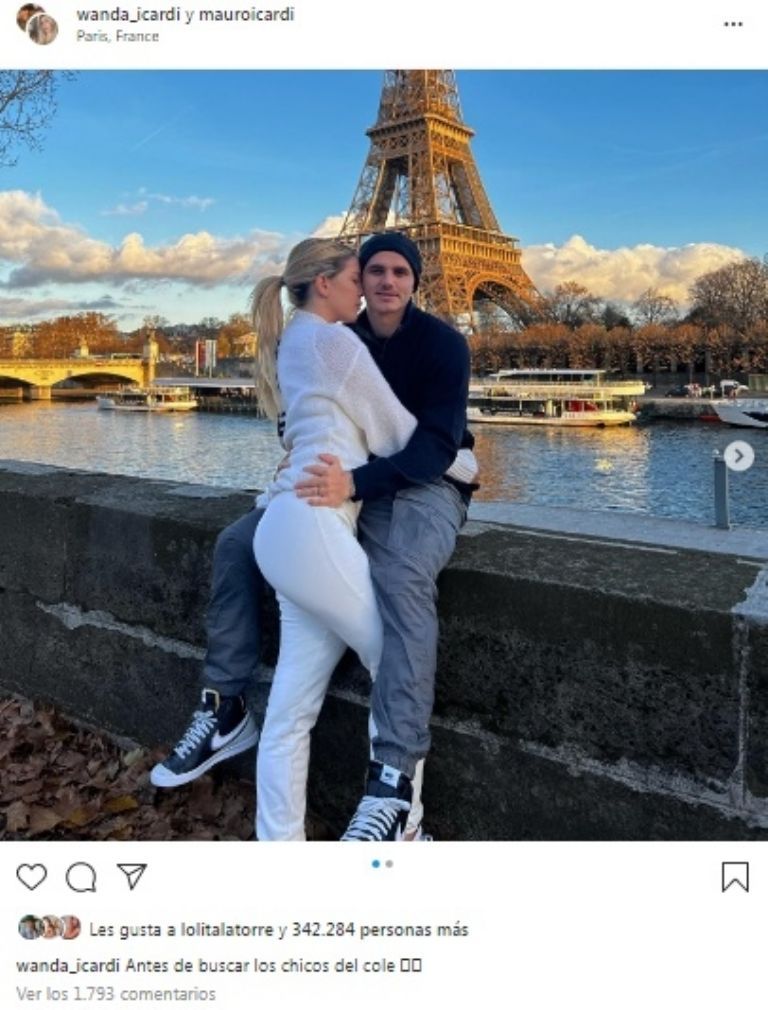 "Antes de buscar los chicos del cole" escribió Wanda junto a una foto en la que se la ve muy acaramelada con el delantero del PSG con la Torre Eiffel de fondo.