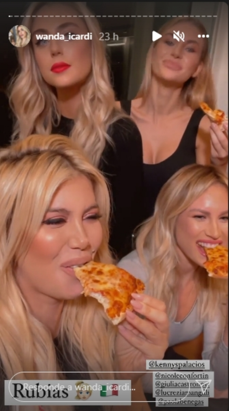 En varias imágenes se la puede ver a Wanda trabajando junto a sus modelos en una nueva producción de fotos para su marca exclusiva de cosméticos. Además, subió divertidas imágenes mientras cenaba pizza junto al equipo.