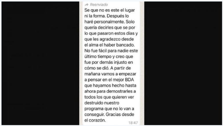 El mensaje empezaba diciendo: "Sé que no es este el lugar ni la forma. Después lo haré personalmente. Solo quería decirles que sé por lo que pasaron estos días y que les agradezco desde el alma el haber bancado". El mismo fue difundido en su grupo de trabajo de WhatsApp y el periodista Ángel de Brito lo difundió en su cuenta de Twitter.