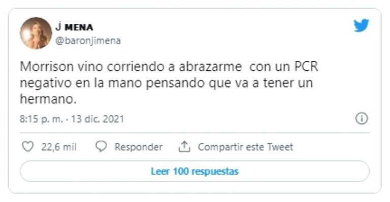 "Morrison vino corriendo a abrazarme con un PCR negativo en la mano pensando que va a tener un hermano", compartió la artista en su cuenta de Twitter. Al mismo tiempo, la cantante de 34 años mostró la reacción del niño al darse cuenta que no era verdad.