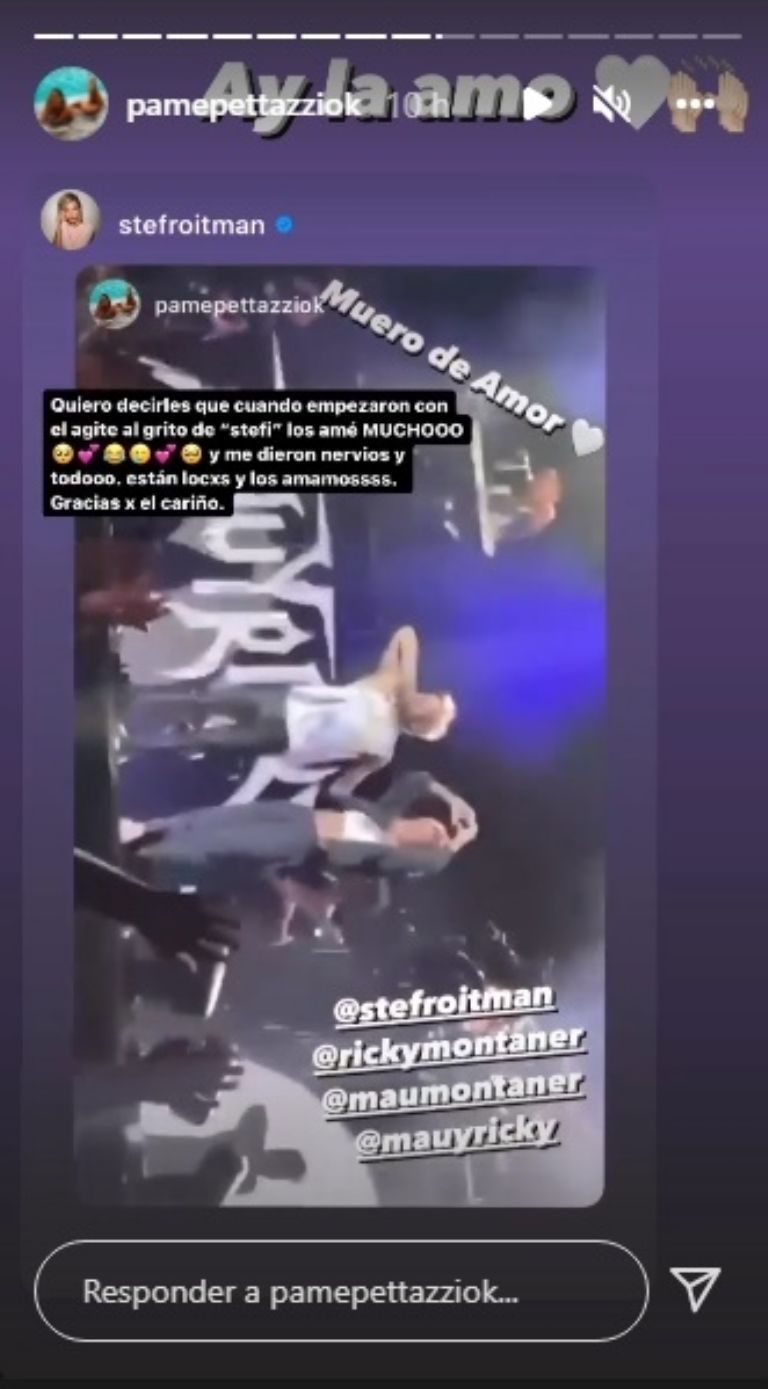 Inmediatamente, la influencer del momento sanjuanina, quien estaba presente entre el público, Pame Pettazzi subió una Storie retratando el momento inmediatamente Stefi lo compartió´, notablemente emocionada y agradecida por el recibimiento.