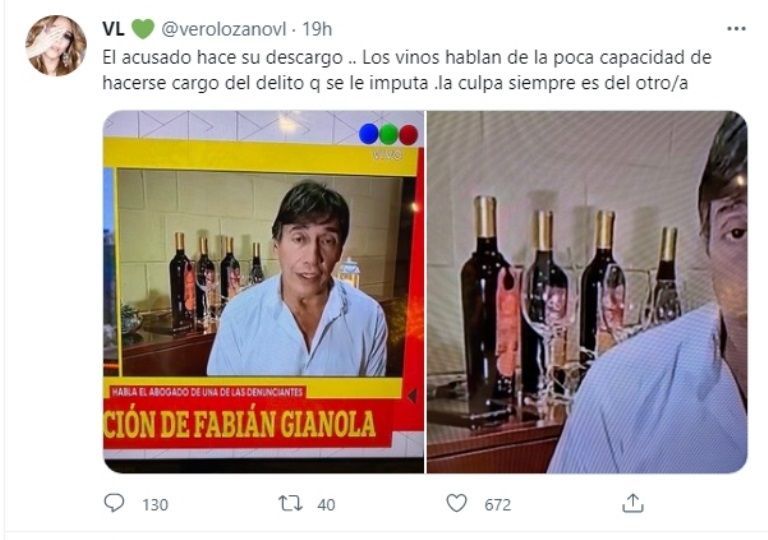 Recordemos que el actor filmó una publicidad en una vinoteca. Más tarde, en ese mismo lugar, hizo su descargo. Para sorpresa de todos, en el video se observaban cuatro botellas de vino a sus espaldas. "Haces un chivo y un descargo frente a una denuncia de abuso sexual. Todo muy normal", remarcó Lozano.
