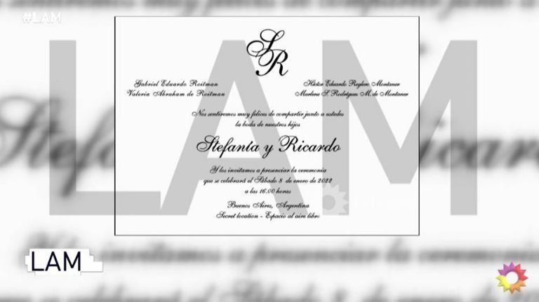 “Se viene una boda donde va a haber muchos famosos, estamos hablando de la de Ricky y Stefi Roitman. Ricky Montaner, el hijo de Ricardo y Stefi Roitman, Stefanía dice la invitación, Stefanía y Ricardo. Nos sentiremos muy felices de compartir junto a ustedes la boda de nuestros hijos, anuncian los padres, que están mencionados también desde la tarjeta”