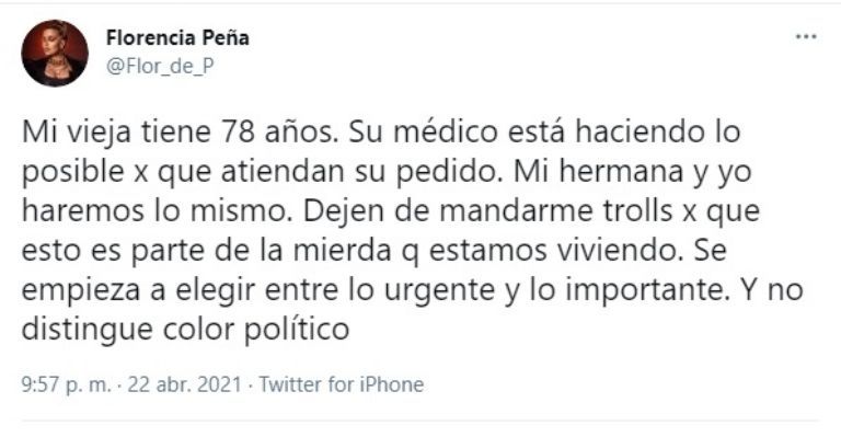 Entre otros mensajes desesperados de Flor, se encuentra un pedido directo al sanatorio de San Isidro donde debería realizarse la intervención, por lo que también apuntó contra las autoridades de salud para que aclaren que el problema de su mamá es realmente urgente y necesita operarse.