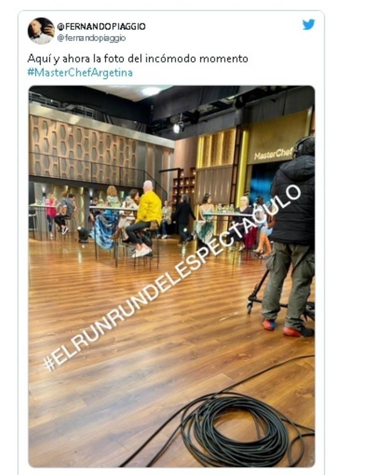 “Aquí y ahora la foto del incómodo momento. #MasterChefArgetina”, fue lo que redactó Fernando Piaggio junto a la foto en donde se ve a Andrea Rincón ocupando el lugar de Analía Franchín en la grabación de la final del certamen y mirando para tras, aun retándola a una discusión completamente insólita.