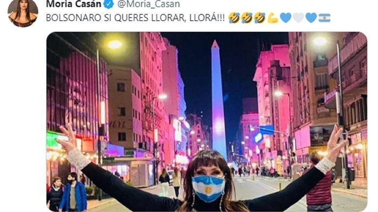 “Bolsonaro, si querés llorar, llorá!!!”, escribió la One, apelando a una de sus frases históricas junto a una foto en la que se la ve, con un barbijo de argentina, festejando junto a una multitud.