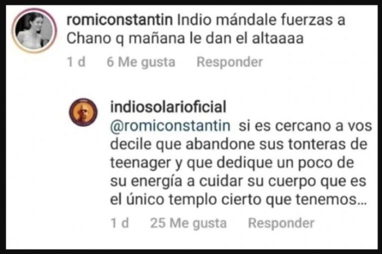 “Si es cercano a vos, decile que abandone sus tonteras de teenager (adolescente, en español) y que dedique un poco de energía a cuidar su cuerpo que es el único templo cierto que tenemos”, fueron las palabras directas que le envió el Indio.