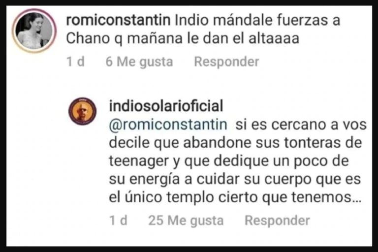 Horas antes de que el ex líder de Tan Biónica grabara dichas imágenes, Carlos El Indio Solari le envió un mensaje público a través de su cuenta de Instagram. Según quedó plasmado en las redes sociales, lo hizo a pedido de una usuaria. “Mandale fuerzas a Chano que mañana le dan el alta”, le escribió la joven al fundador de Patricio Rey y sus Redonditos de Ricota.