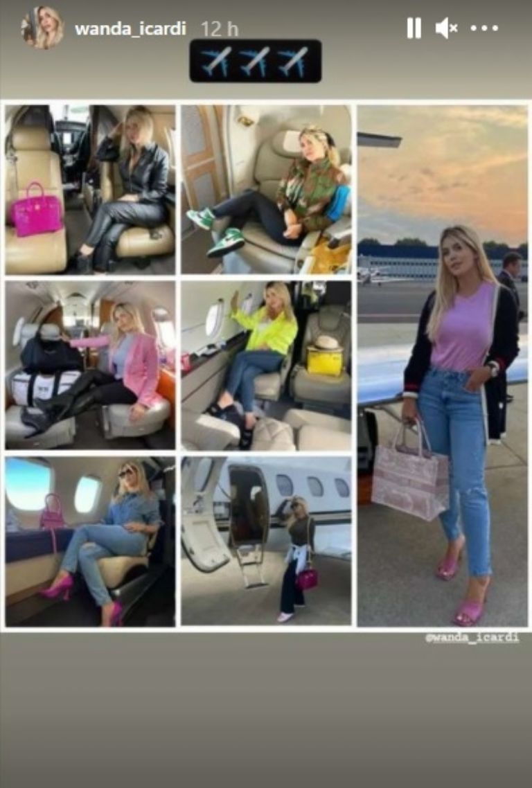 Todas las imágenes remiten directamente a vuelos en avión, pero principalmente destaca el amplio vestuario de la pareja de Mauro Icardi.
