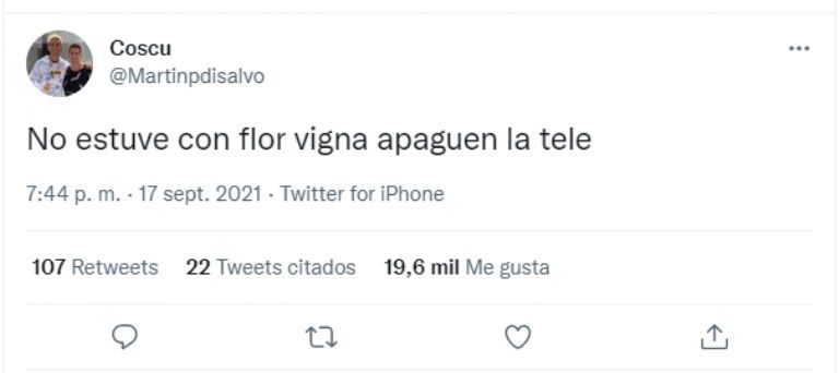 Y por su parte, Coscu, utilizó su cuenta de Twitter para dar su versión: "No estuve con Flor Vigna apaguen la tele", escribió el streamer.