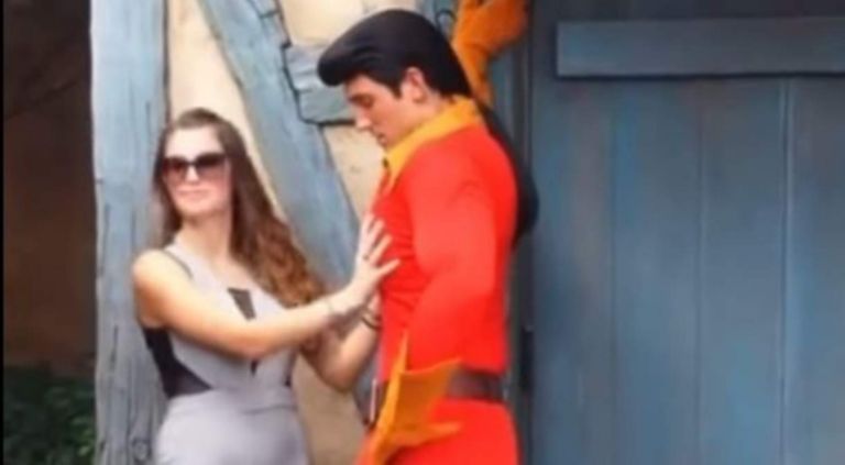 La chica, pensando que el actor está bromeando comienza a reírse e incluso intenta volver a tocarlo. Ante la insistencia de la mujer de tocarlo de manera indebida, Gastón, personaje de Disney, le pide de nueva cuenta que se vaya de ahí.