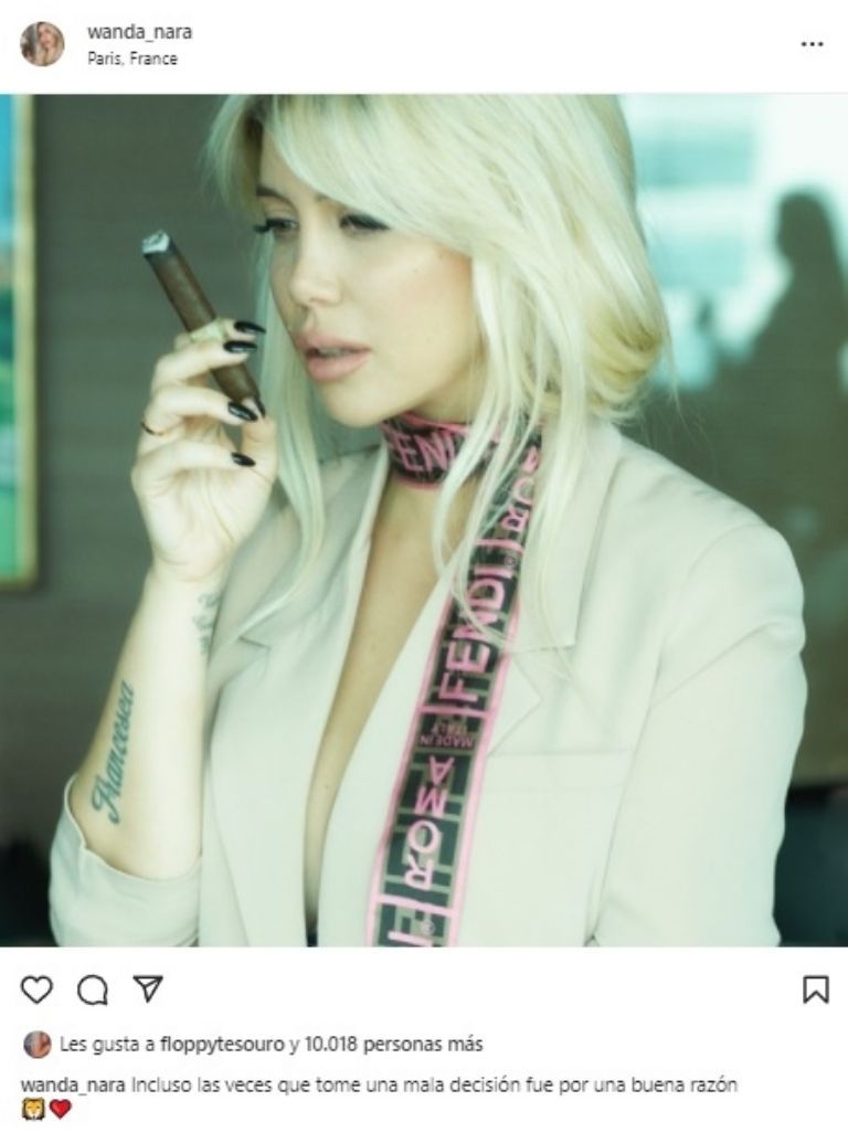 "Incluso las veces que tome una mala decisión fue por una buena razón", expuso Wanda junto a una imagen llamativa, con un puro en la mano.
