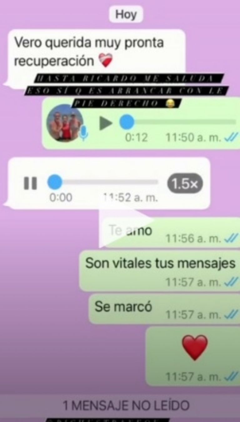 "Hola Vero querida, te habla Ricardo desde Miami. Acá estamos con Evaluna, con Camilo, con Mau y Ricky y toda la familia... Te mandamos un gran cariño, muchas bendiciones... que Dios te bendiga, sabes. Cuídate mucho, la tobillera. Te mando un abrazo enorme".