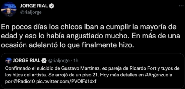 Mediante su cuenta oficial de Twitter, Jorge Rial informó que Gustavo Martínez se quitó la vida ante la inminente mayoría de edad de Marta y Felipe, los hijos de Ricardo Fort que estaban bajo su cuidado.
