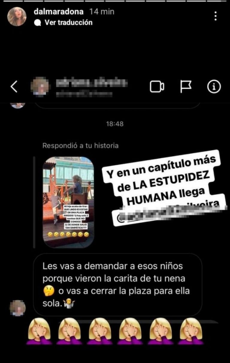 Pero parece que a los seguidores de la actriz esa decisión no les gusta nada. Tal es así que una seguidora la increpó en redes y le preguntó si iniciaría acciones legales contra los niños que vieron a su hija en una plaza de juegos. Tajante, Dalma Maradona catalogó el comentario como "un capítulo más de la estupidez humana".