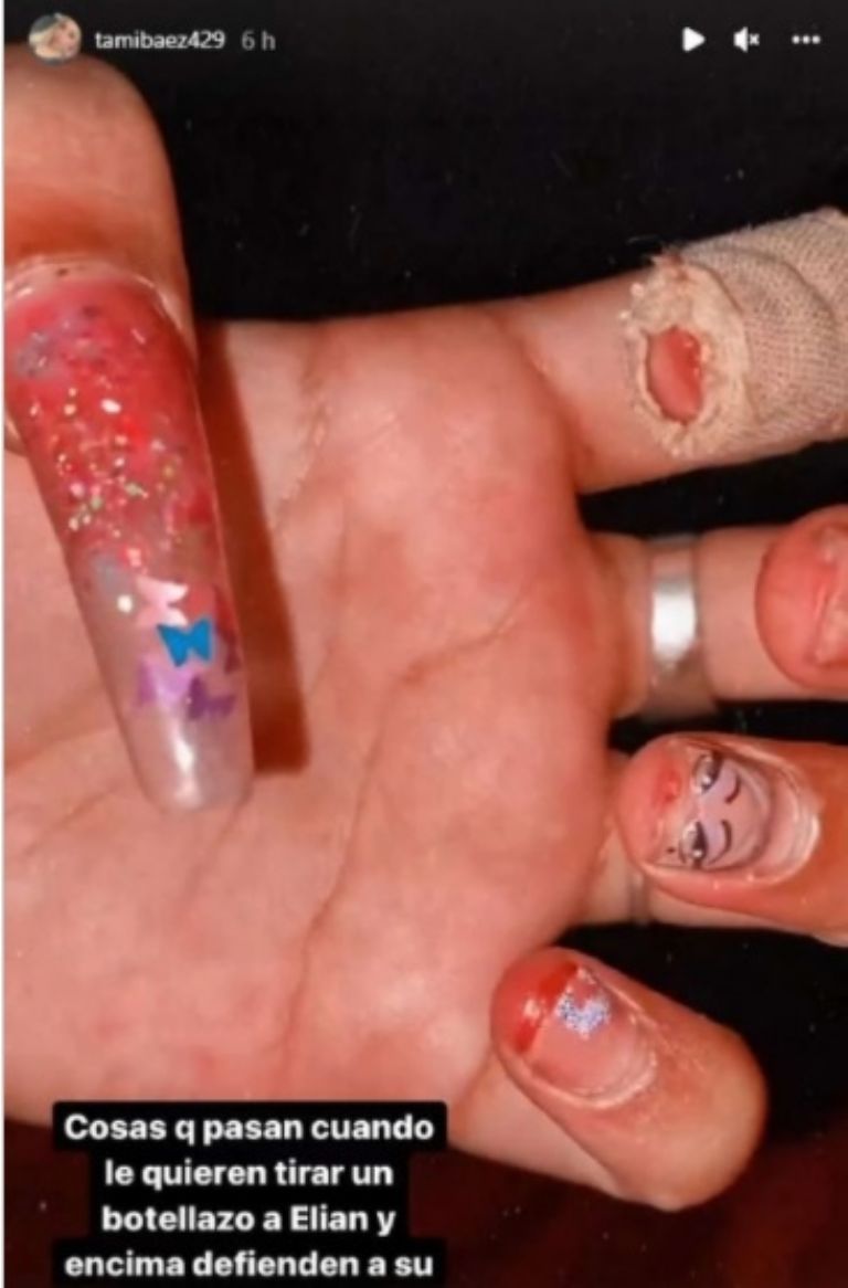 Horas antes, Tamara, la novia y madre de la hija de L-Gante, mostró en su cuenta de Instagram sus manos lastimadas y explicó que esa era la consecuencia de un “botellazo” que habían querido lanzarle por la cabeza a Elian (el músico). Ninguna de las partes lo aclaró, pero es muy posible que este episodio esté asociado a la hospitalización posterior.