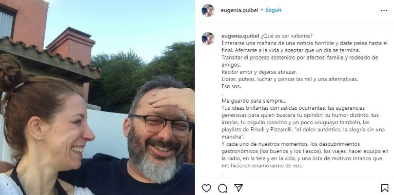 Minutos después de que se conoció la triste noticia de la muerte de Gerardo Rozín, Eugenia Quibel, su último gran amor escribió una reflexión en redes sociales, y lo hizo junto a una foto de la pareja, sonrientes. “¿Qué es ser valiente? Enterarse una mañana de una noticia horrible y darle pelea hasta el final. Aferrarse a la vida y aceptar que un día se termina. Transitar el proceso sostenido por afectos, familia y rodeado de amigos. Recibir amor y dejarse abrazar. Llorar, putear, luchar y pensar las mil y una alternativas. Eso sos”, comenzó la locutora.