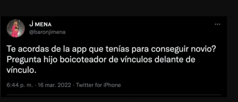 ¿Te acordás de la app que tenías para conseguir novio?'... Pregunta hijo boicoteador de vínculos delante de vínculo", dijo exactamente Jimena Barón en Twitter y enseguida también comenzaron las preguntas en relación a por qué se refiere a Matías como a su "vínculo". Preguntas hay muchas, pero la felicidad es evidente.