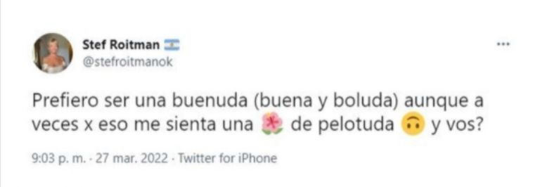 Hace algunas horas, sin ir más lejos, la influencer apareció en Twitter con una reflexión poco clara y que parecía estar dirigida a Ricky Montaner. Stefi Roitman escribió que prefiere ser demasiado buena aunque aveces le juegue en contra. Enseguida sus seguidores le preguntaron a quién se refería y ella prefirió no seguir hablando.