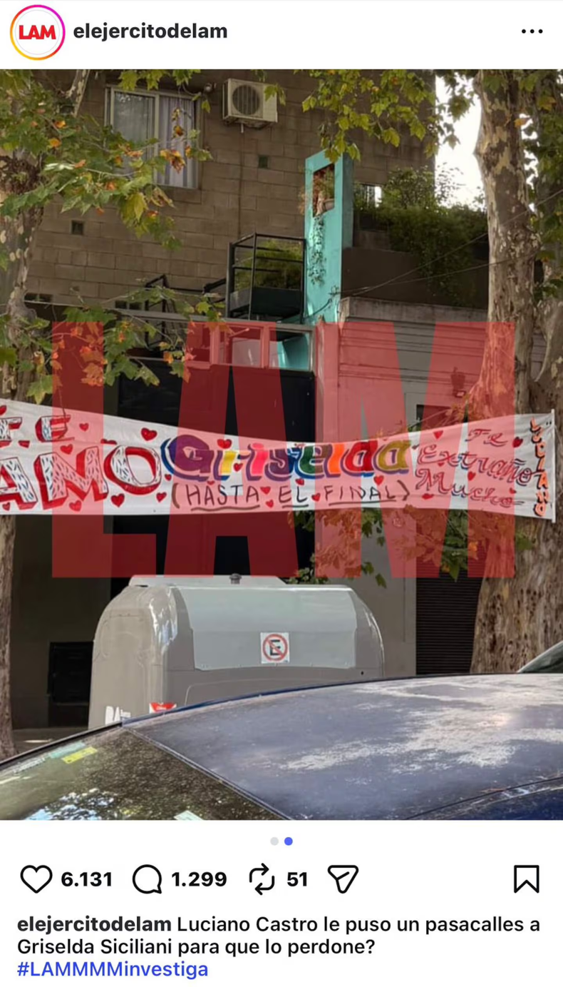 Pasó algo increíble en la mañana de este sábado en Buenos Aires. Un insólito pasacalle apareció en la puerta de la casa de Griselda Siciliani. Se desconoce quién lo mandó, pero por lo que estaba escrito, al parecer fue de Luciano Castro.