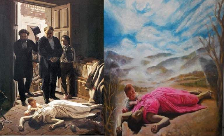 Dos imágenes parecidas con mensajes diferentes. Ambas lograron captar la atención de dos clases sociales en los extremos de la pirámide. Una es la obra "Un episodio de fiebre amarilla en Buenos Aires", de Juan Manuel Blanes, realizada en 1871; la otra es de 2015, la "Difunta Correa" de Tiziano Fabris, quien tomó la figura de la mujer y el niño de Blanes para su obra y, con una imagen resignificada, logró congregar un público de lo más heterogéneo.
