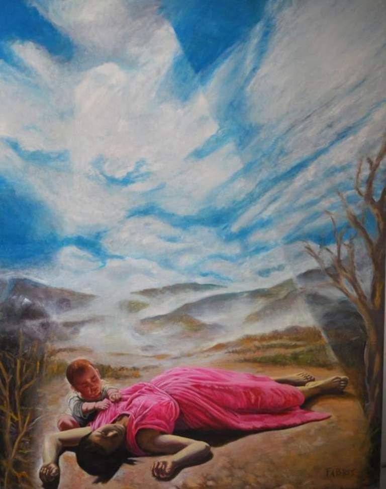 La mujer y su hijo aparecen ahora en el desierto sanjuanino, aunque conservan casi la misma estética. "Quise dejarla verosímil, entonces la pinté no desde una perspectiva kitsch sino con la misma estética, el formato y el soporte, incluso el tamaño es igual al óleo, 230 x 180 centímetros. Pero al ponerla en el desierto, se entrecruzan dos historias con un relato distinto y de alguna forma hace rever muchas cosas", aseguró el artista.