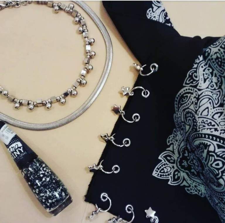Choker doble cadena y cuentas, bandana con dijes y esmalte con glitter black and white te están esperando. Date una vuelta y enamorate en ModaShop San Juan.