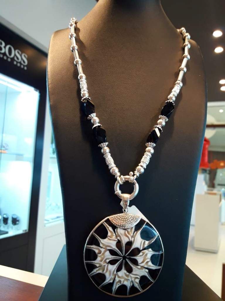 Cadena de plata 925 con cierre marinero y detalles en piedra onix y dije de nácar