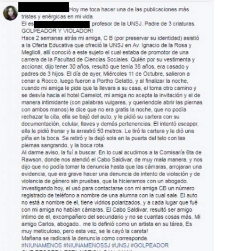 Esta publicación, acompañada de fotos de la boca de la chica lastimada, invadieron las redes sociales e inclusive fueron publicadas por la misma persona en el perfil de Facebook de la UNSJ, este viernes, pero para el sábado los comentarios ya habían sido retirados.
