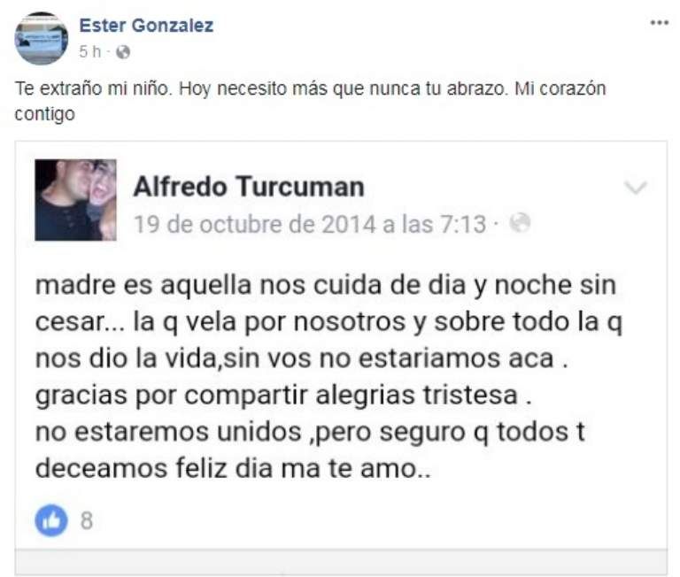 Este Día de la Madre es tristemente especial para Ester González, la madre de Alfredo Turcumán, el joven de 28 años que fue apuñado por su esposa Caludia Moya el pasado 13 de junio. Es el primero que festeja sin contar con la presencia de su hijo y asì lo hizo saber con una sentida publicación en su muro de Facebook.