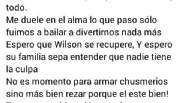 La joven también se dirigió a la familia de Ruarte, quien tiene mujer y un hijo, y dijo que "me duele en el alma lo que pasó, sólo fuimos a bailar, a divertirnos, nada más. Espero que Wilson se recupere y espero que su familia sepa entender que nadie tiene la culpa.